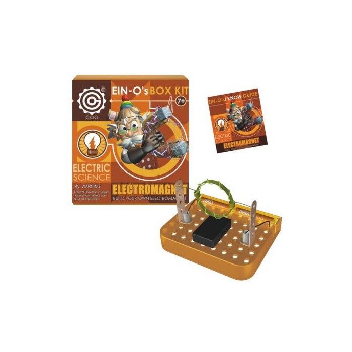 Build your own electromagnet! This Electromagnet kit teaches the properties of electricity and magnetism through fun, hands-on experiments that further the educational experience. With the Ein-O I Know Guide, young scientists will build their own electromagnet that will make a copper wire turn and glow-in-the-dark thread glow. Includes compact workbench, connector springs, glow-in-the-dark thread, insulated copper wire, plain copper wire, iron rod, metal stand, paperclips, sandpaper, strong flat magnet and a convenient plastic storage box. For ages 8+.