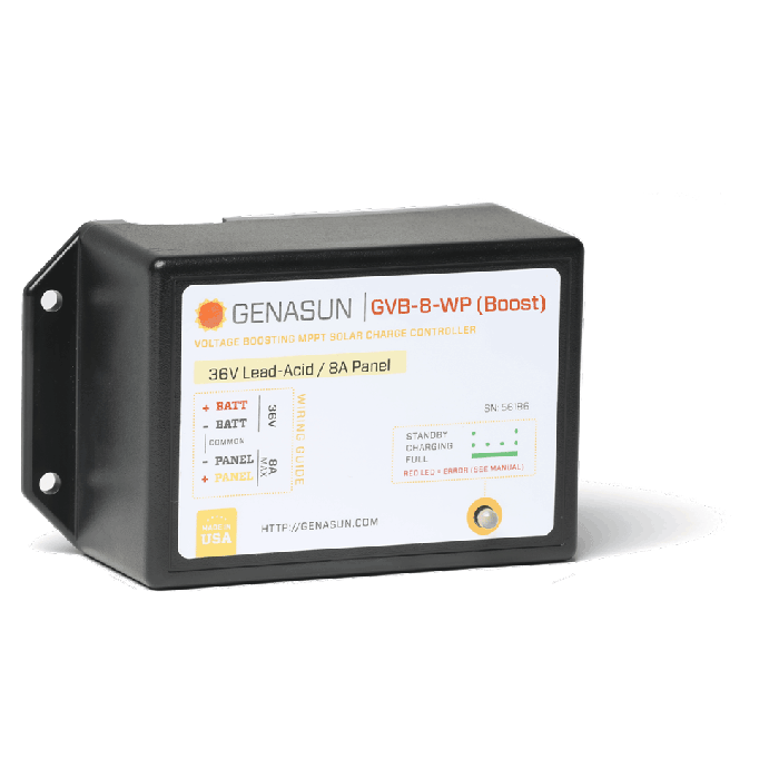 A true problem-solver, the unique GVB-8-WP charge controller with MPPT allows a lower-voltage solar panel to charge higher-voltage batteries. Want to charge a 24V battery with a 48-cell solar panel? No problem. A 48V battery from a 12V panel? We’ve got you covered. With 99% peak efficiency, they are the industry’s most efficient voltage-boosting controllers. True MPPT delivers consistent performance, unlike the “Nominal MPPT” of competitors. The advanced electronics inside the controller are encased in a proprietary potting compound making them ideal for golf-cart, marine, and vehicle applications.