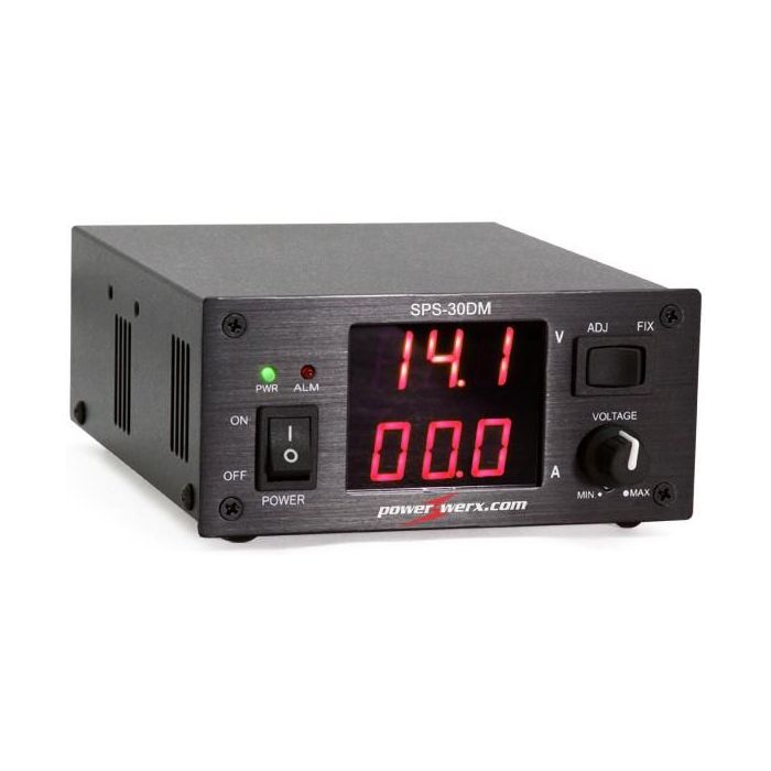 The Powerwerx dual metered digital power supply model SPS-30DM is designed to supply 25 Amps continuous and 28 Amps surge. It features user variable output (5~16 VDC) by adjusting the front mounted knob, or fixed 14.1 VDC output. Power output is through the rear mounted 1/4" binding posts.